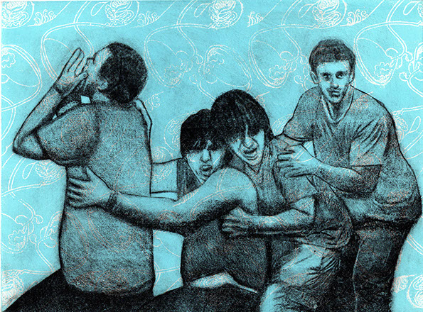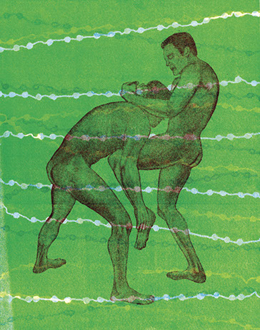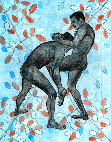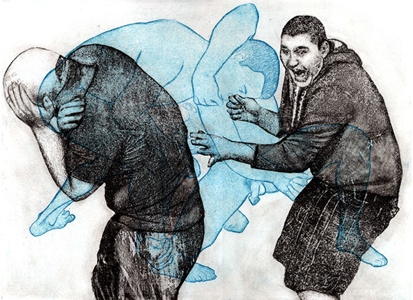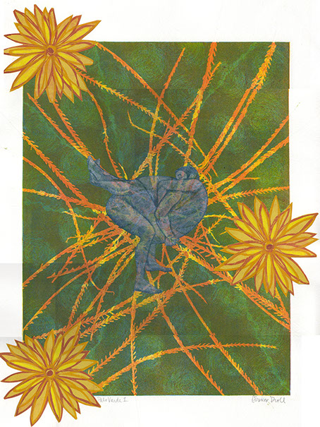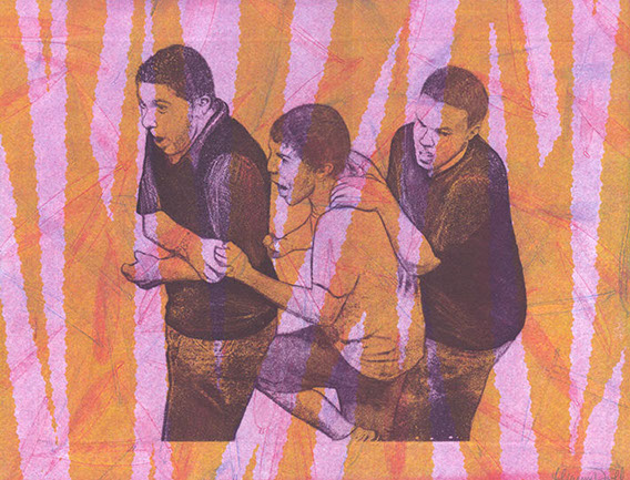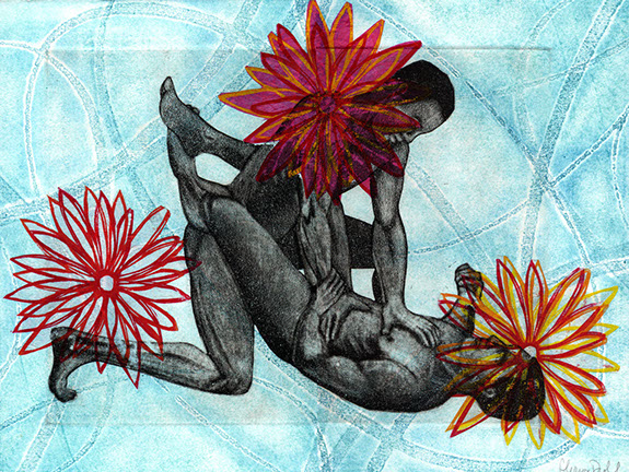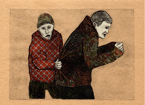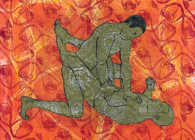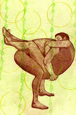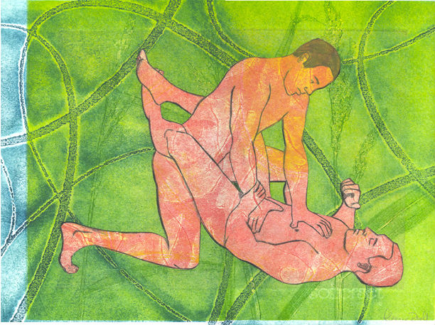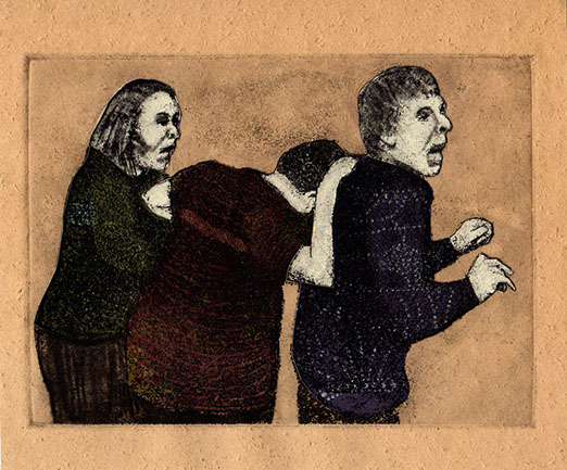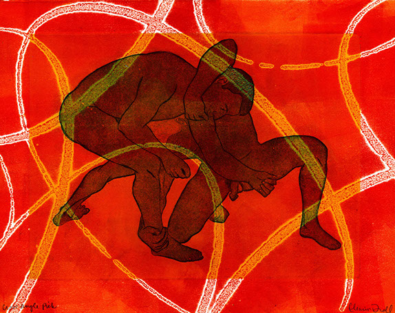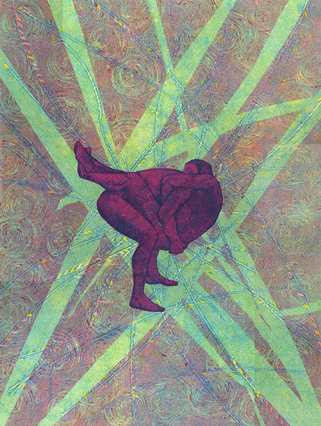 Escaping Neck Clinch, color etching with monotype and relief, 11" x 8"