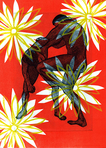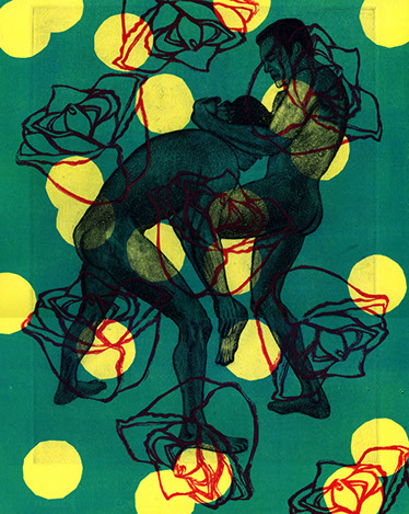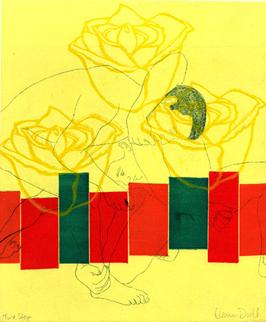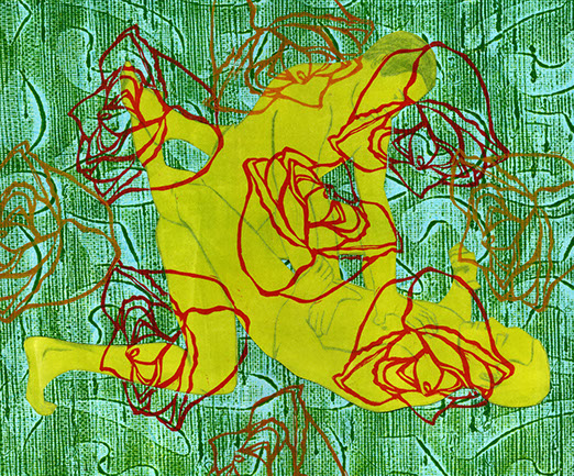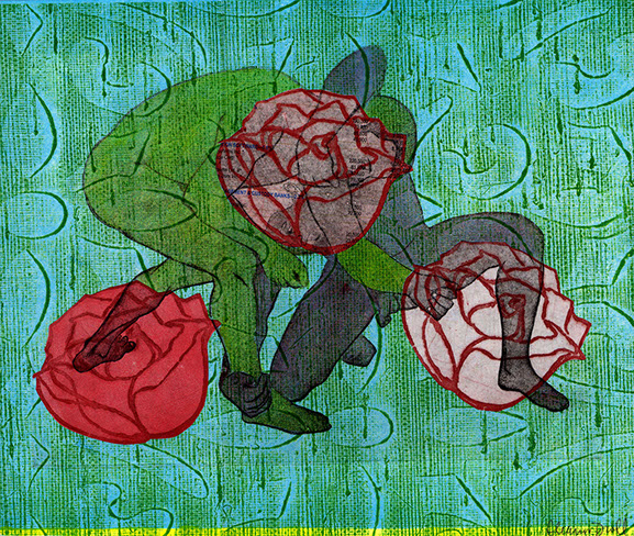 Cross Angle Pick with Roses, color etching with relief and chine colle, 13" x 11"