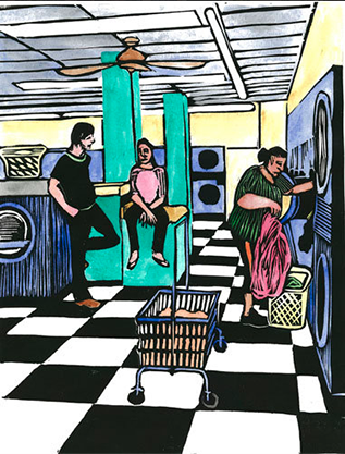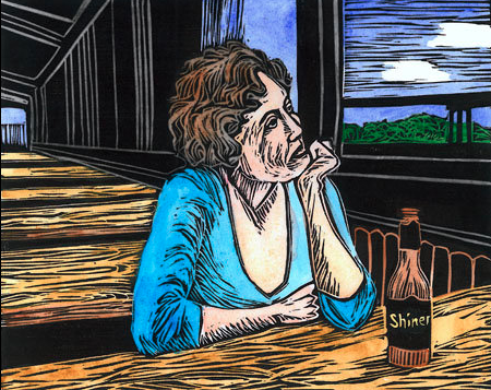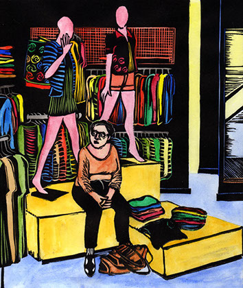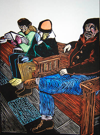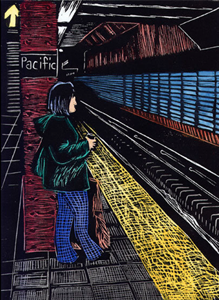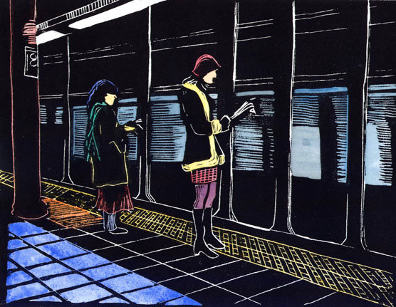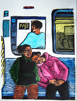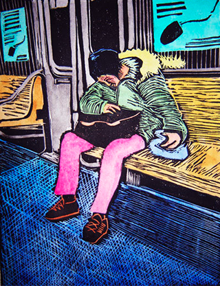 Waiting on the 6, relief print with watercolor, 10.5" x 7.5"