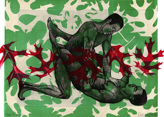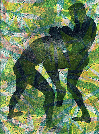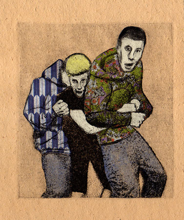 Man up 2, etching with applied origami paper, 8.5" x 10"