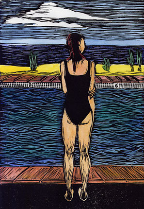 Brighton Beach, relief print with watercolor, 10" x 13.5"