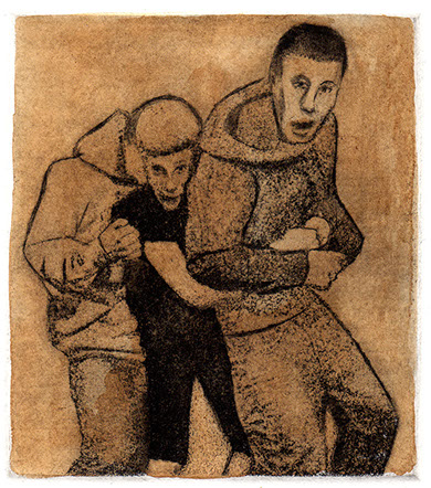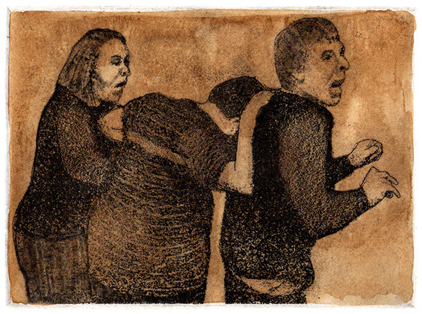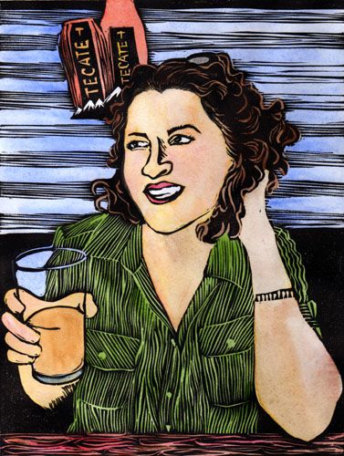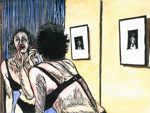 MJB, relief print with watercolor, 10.5" x 7.5"