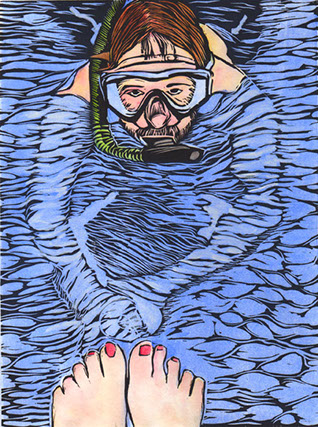 At Lia's Feet, relief print with watercolor, 13.5" x 10"
