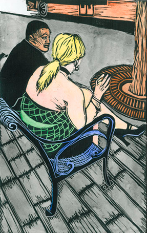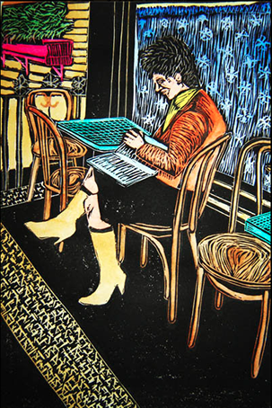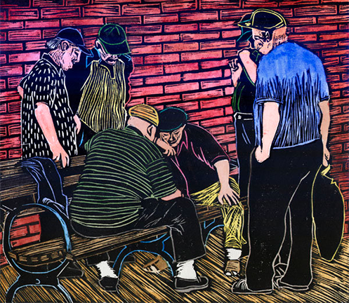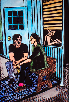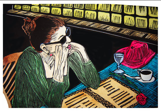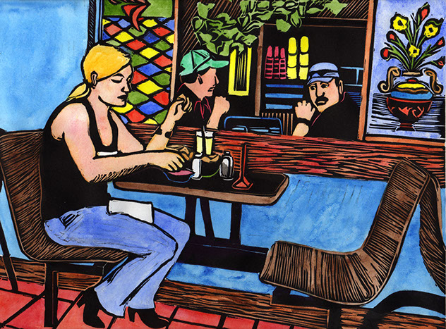 Luncheon in Italy, relief print with watercolor, 11" x 8"