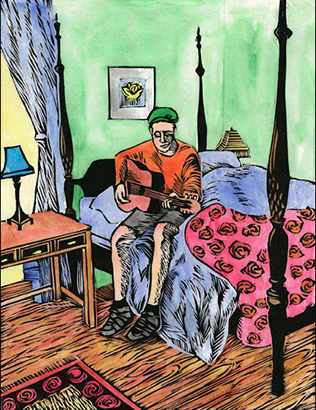 Musician, relief print with watercolor, 13" x 11", photo by Will Andrews