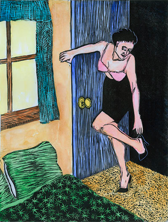 Sleeper, relief print with watercolor, 8.5" x 7"