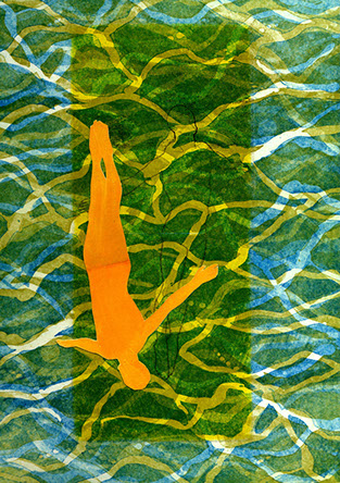 Cross Angle Pick (orange), etching with monotype, 11" x 15"